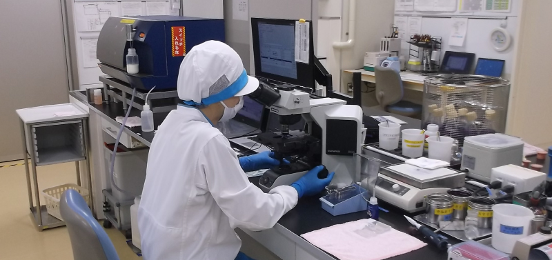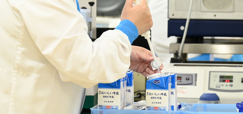 生乳受入時、各タンクローリーから生乳のサンプルを採取し、受入検査を実施します。