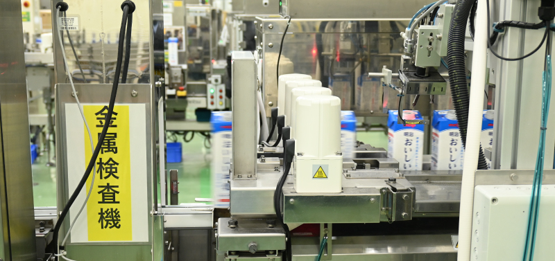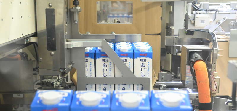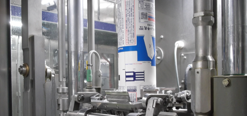 機械が容器を組み立て、できあがった牛乳を容器につめていきます。